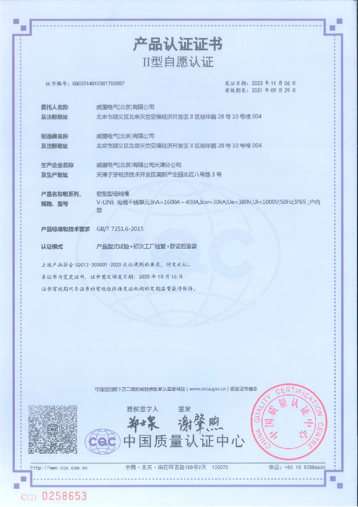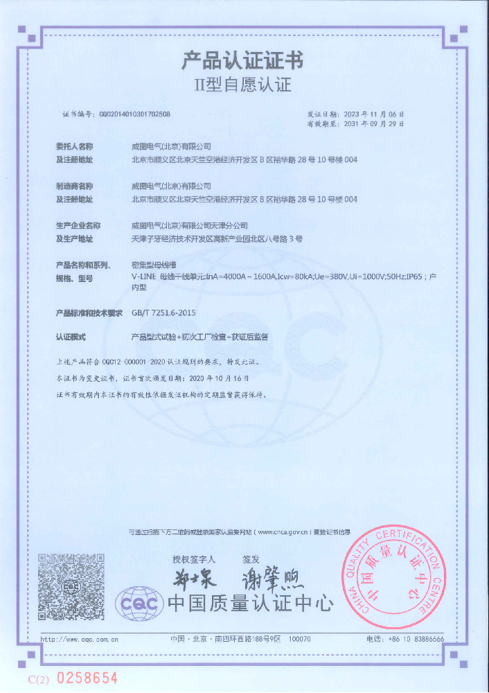 密集型母线槽400-1600A国家强制性产品认证证书