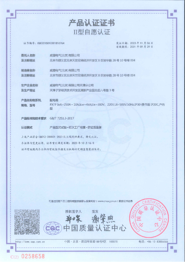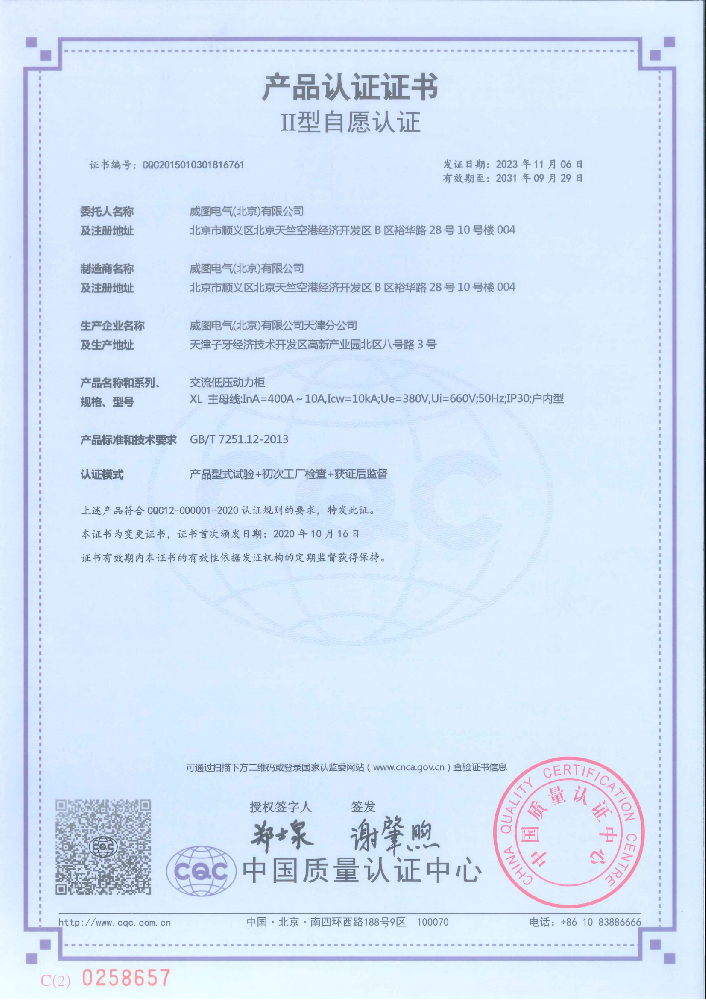 交流低压动力柜强制性产品认证证书