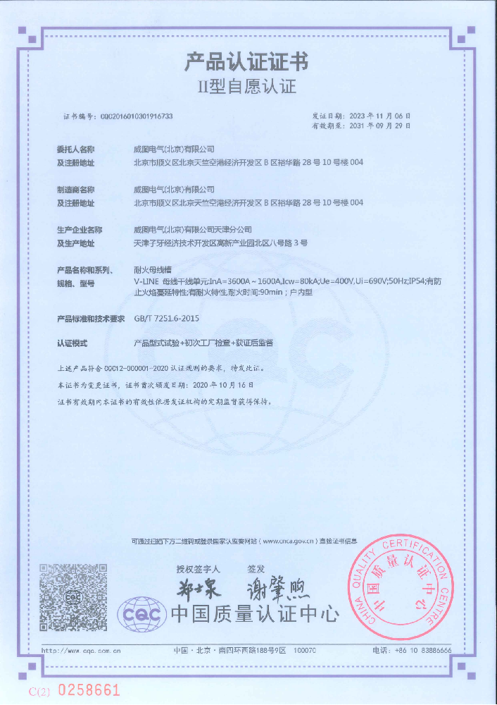 威图耐火母线槽1600-3600A国家强制性产品认证证书