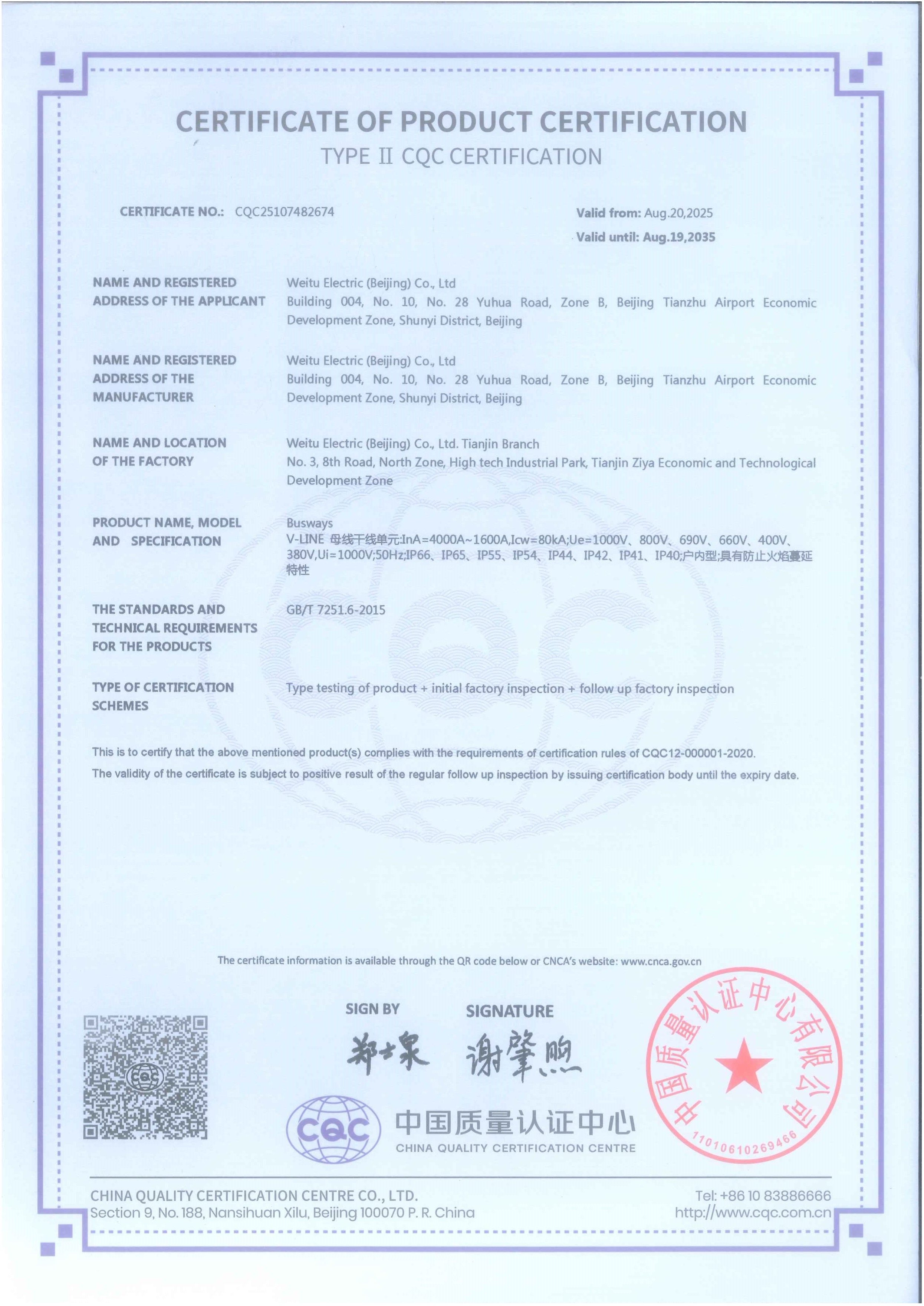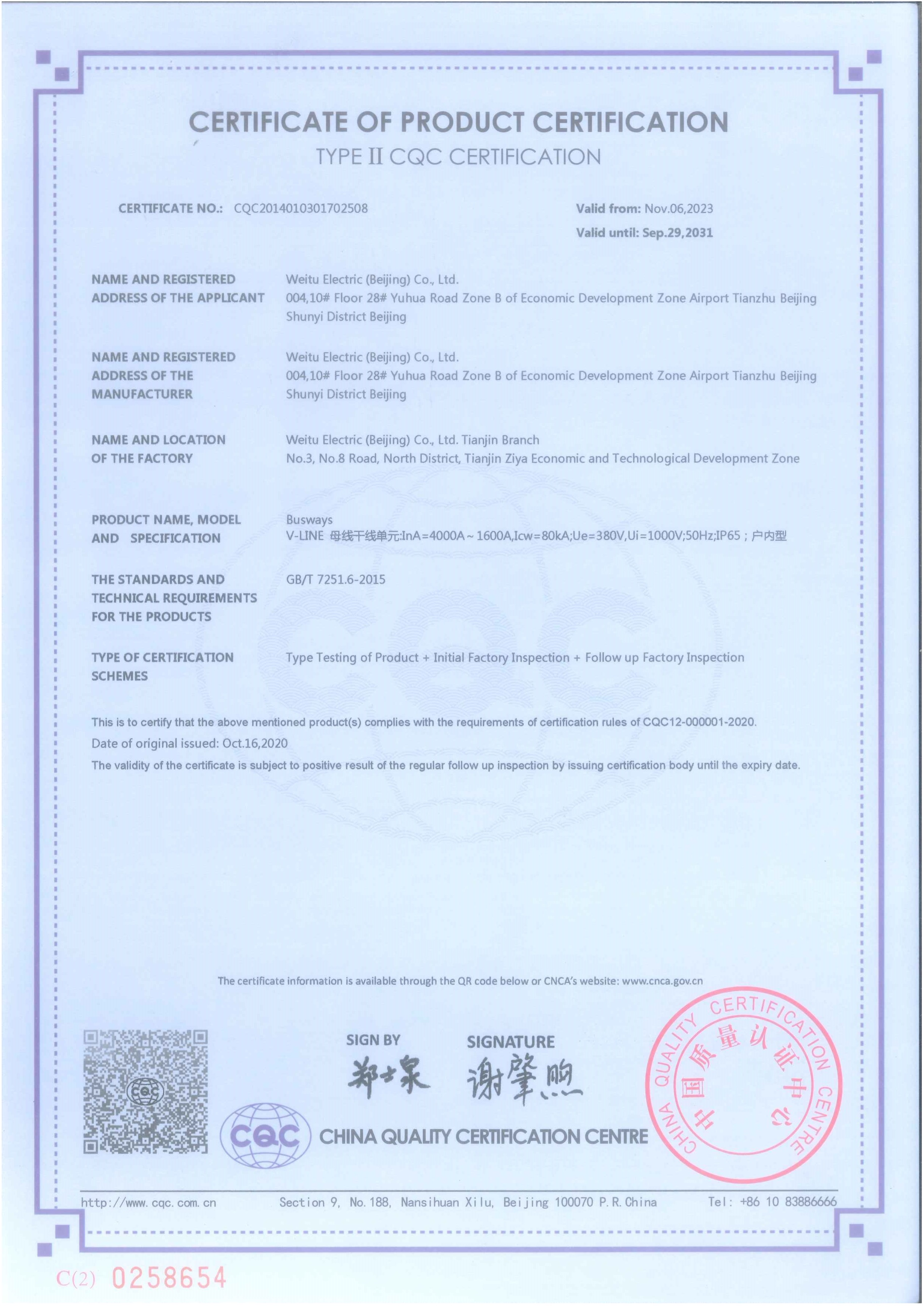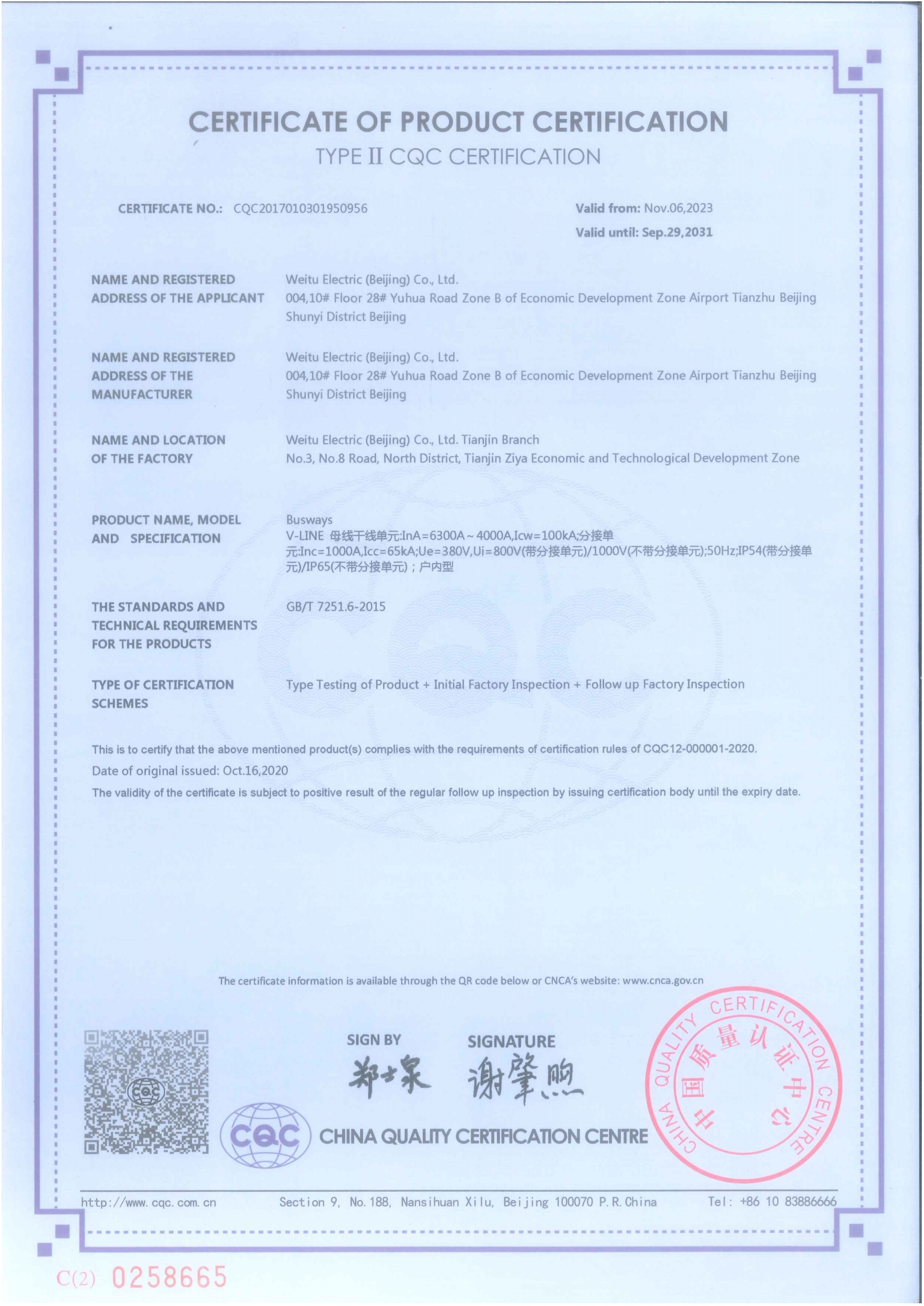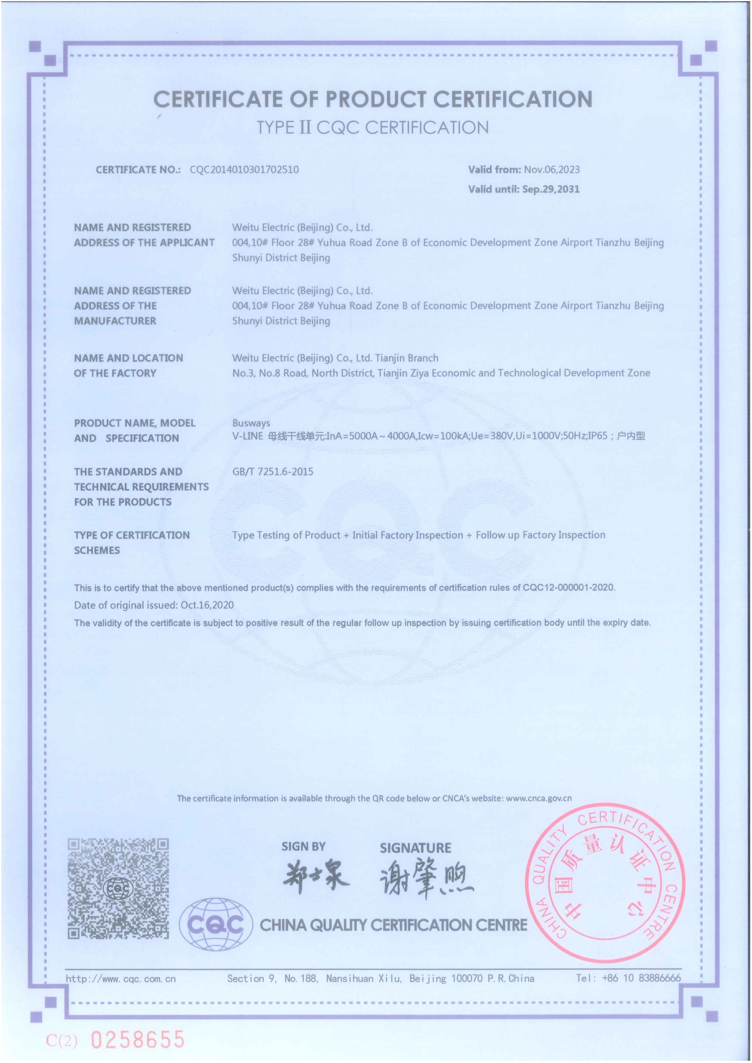 China Compulsory Certification Certificate for Sandwich Copper Busway (6300A-4000A)