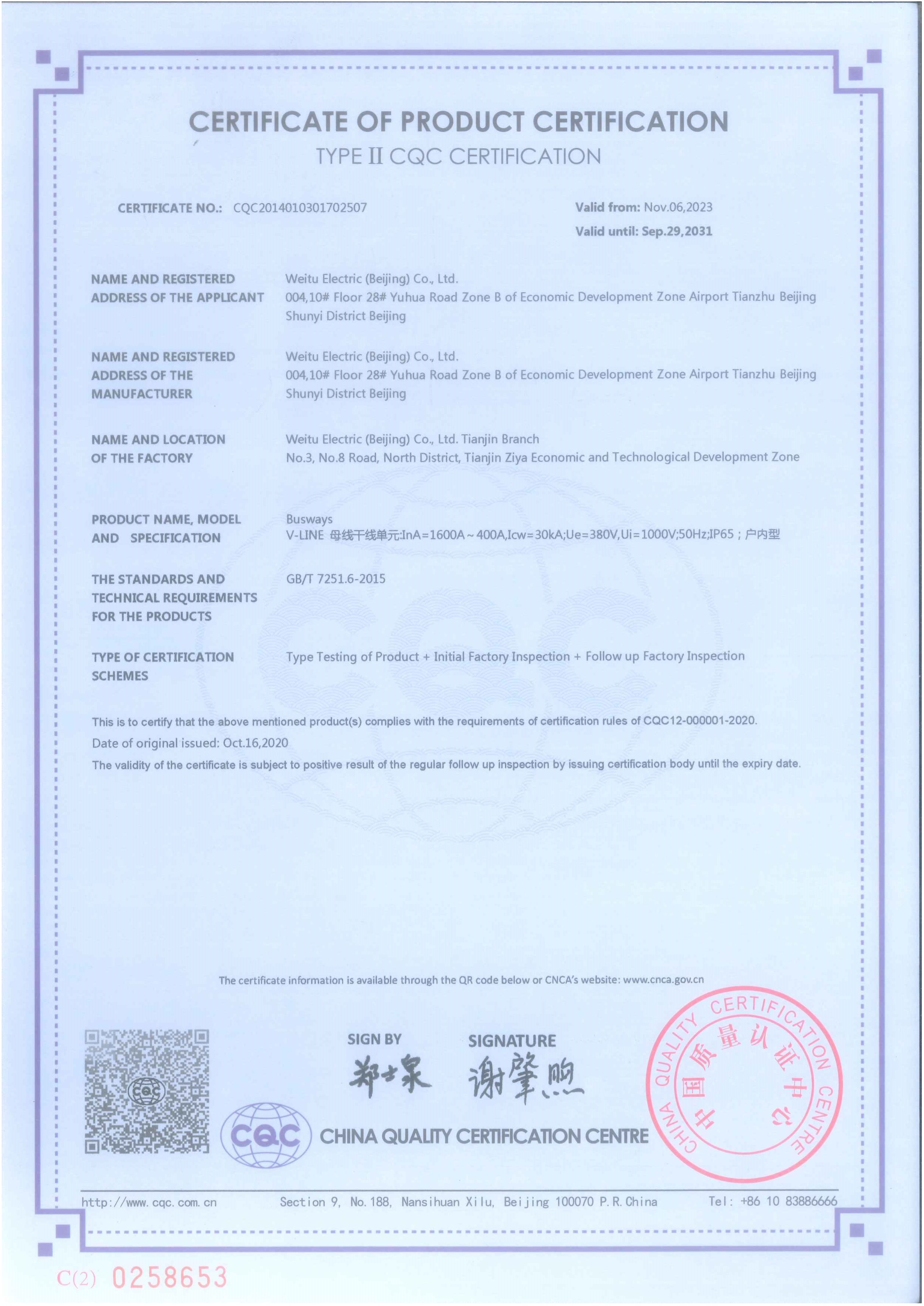 China Compulsory Certification Certificate for Sandwich Copper Busway (1600A-400A)